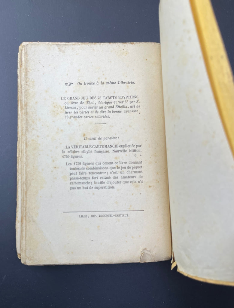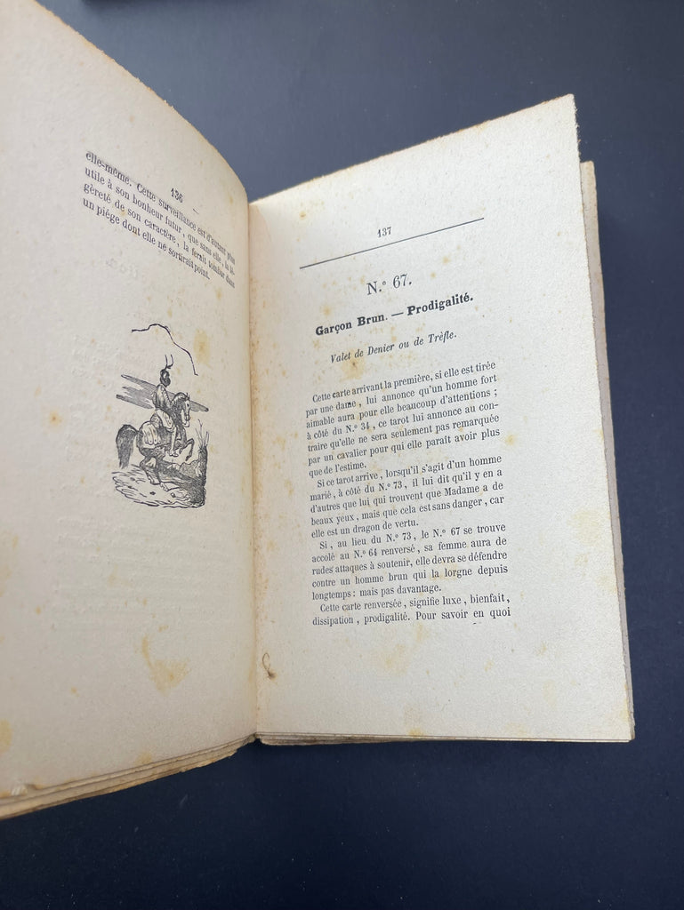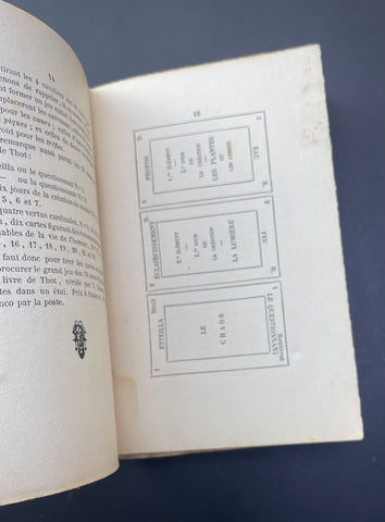 2.° L'indication des tarots qui composent le véritable livre de Thot avec la manière de les remplacer dans le cas où l'on ne pourrait pas se les procurer 3.° Une méthode au moyen de laquelle on peut facilement apprendre soi-même sa destinée et à dire la bonne aventure