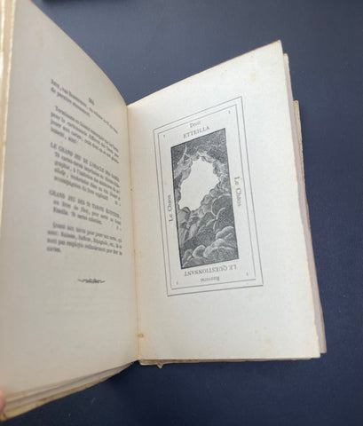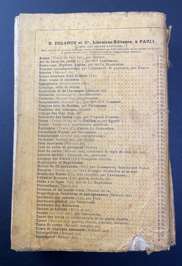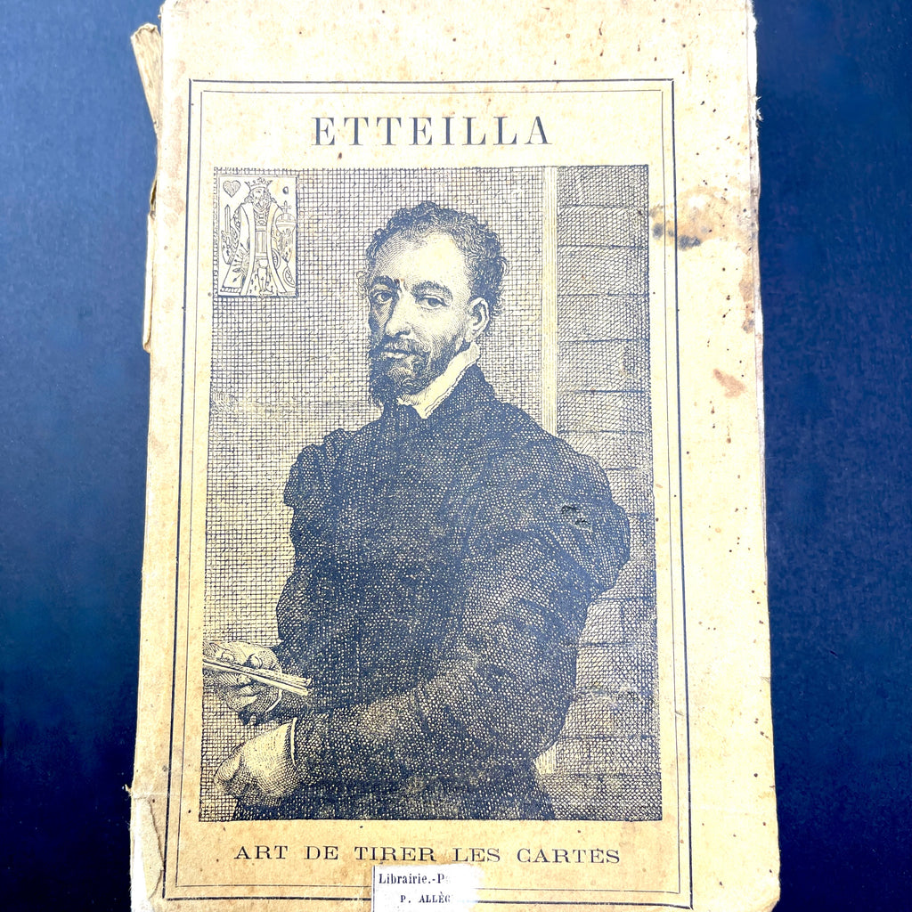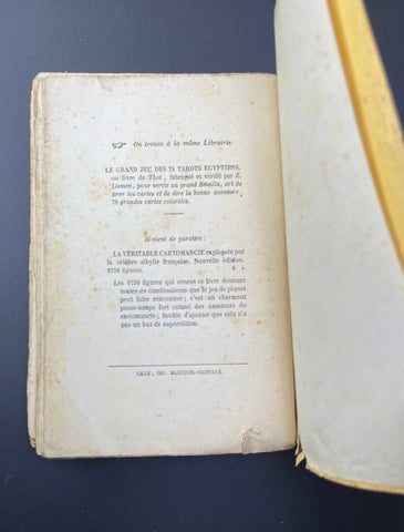 Orsini, Julia (pseud.Bloquel, Simon). Le Grand Etteilla ou L'art de tirer les cartes et de dire la bonne aventure et dire la Bonne Aventure. Paris: Delarue, Lille Blocquel-Castiaux, n.d. [c.1884]. Later Edition (4th?), 16mo., pp.204 (28), (pp. 24 illustrations + pp4 Table of Contents); 24 pages of Le Grand Etteilla II (Lismon) and Le Grand Oracle des Dames, Etteilla III cards illustrated in black and white illustrations of cards; The Major Arcana, Courts, are given full page illustrations and are from the Grand Etteilla II (Lismon) deck, while the pip illustrations are four per page and from the Etteilla III, Le Grand Oracle des Dames (Lismon). Paper cover bindings, front cover with portrait of Etteilla [which is actually a portrait of Giovanni Pietro Maffei (1553-1603)], Italian Jesuit author], back cover with advertising for a list of other books by H. Delarue; the front cover has a remnant sticker from a previous owner, and reads "Librairie.- P(a?)... /P. ALLÈG.../ à A...".