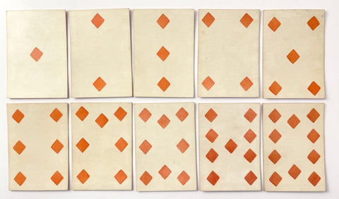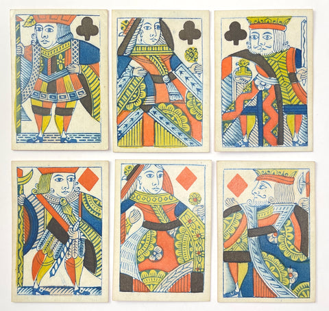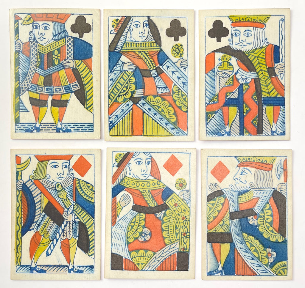 Cards in good condition, complete 52/52 cards, with signs of some wear from use; occasional stains and light toning, minor surface scuffing and soiling; five of Diamonds with corner crease. (see photographs)