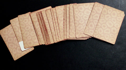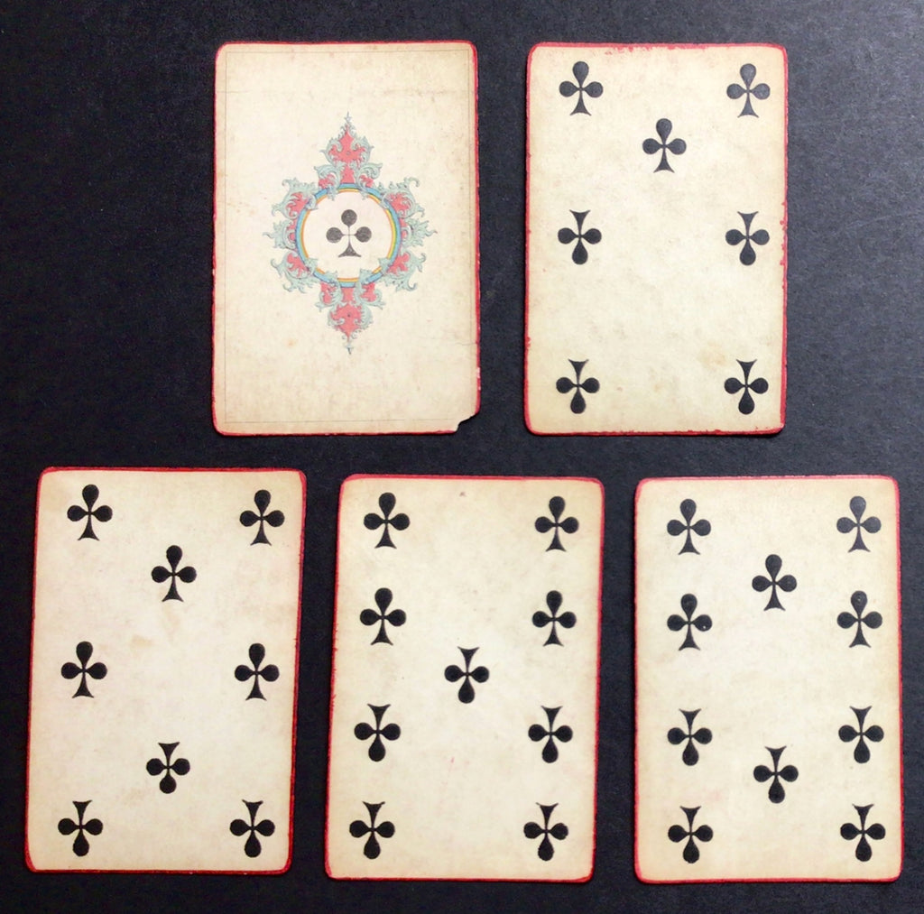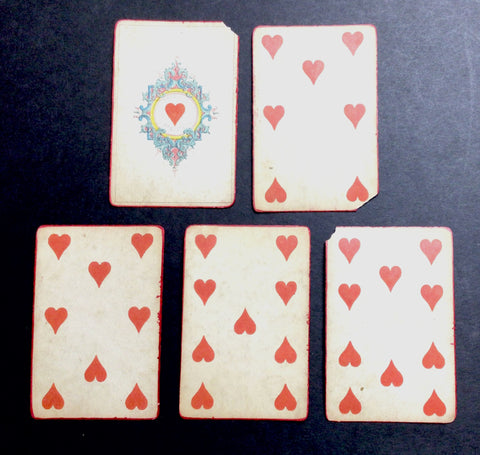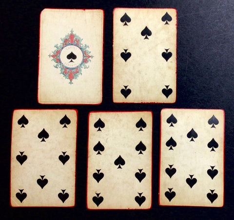 DESCRIPTION: One of Daveluy's earliest packs, the "Première Croisade," is here presented as a piquet deck with 32 cards (of the original 52 cards?), consisting of a King, Queen, and Jack, as well as the Ace, 7, 8, 9 and 10 for each suit. The red border around the cards appears to be painted by the hand of a previous owner.