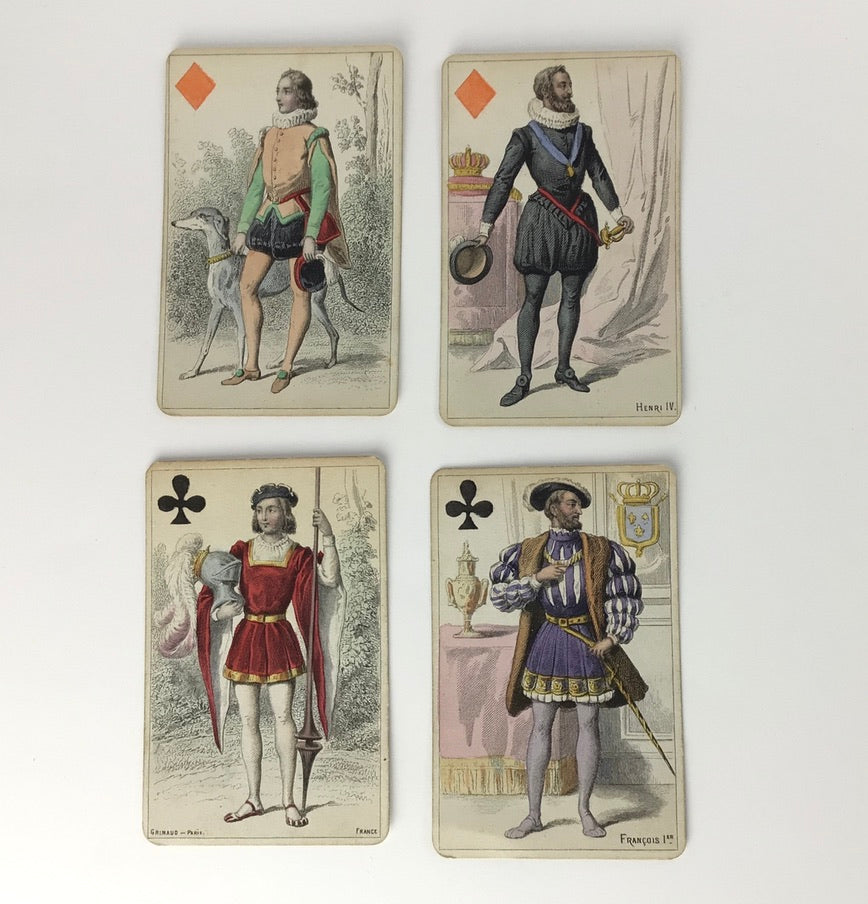 Description:  This beautiful deck was first published by B.P. Grimaud in c.1856 and reprinted in c.1891. These costume playing cards are exquisitely engraved and hand-painted. Deck with gold-gilt corners.