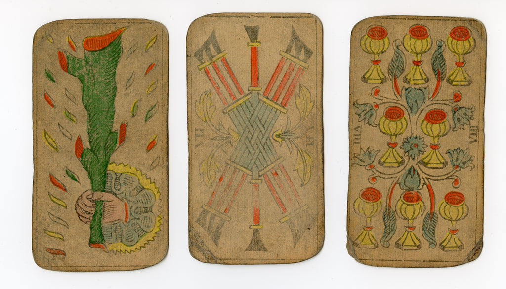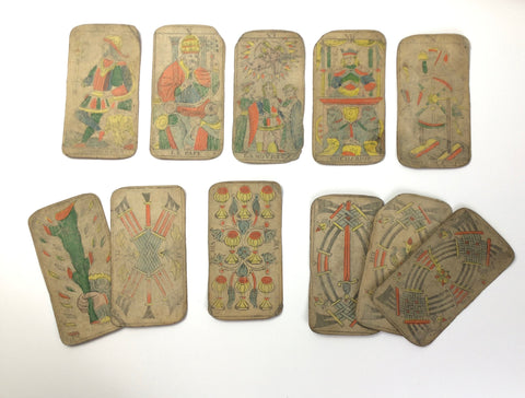 DESCRIPTION: Twelve rare mid-19th century Marseille tarot cards by Bernardin (a.k.a Suzanne Bernardin). Beautiful French colouring and stunning stencilled images that retain the unpainted white faces, which at the time of their production, were considered to be rather haunting.