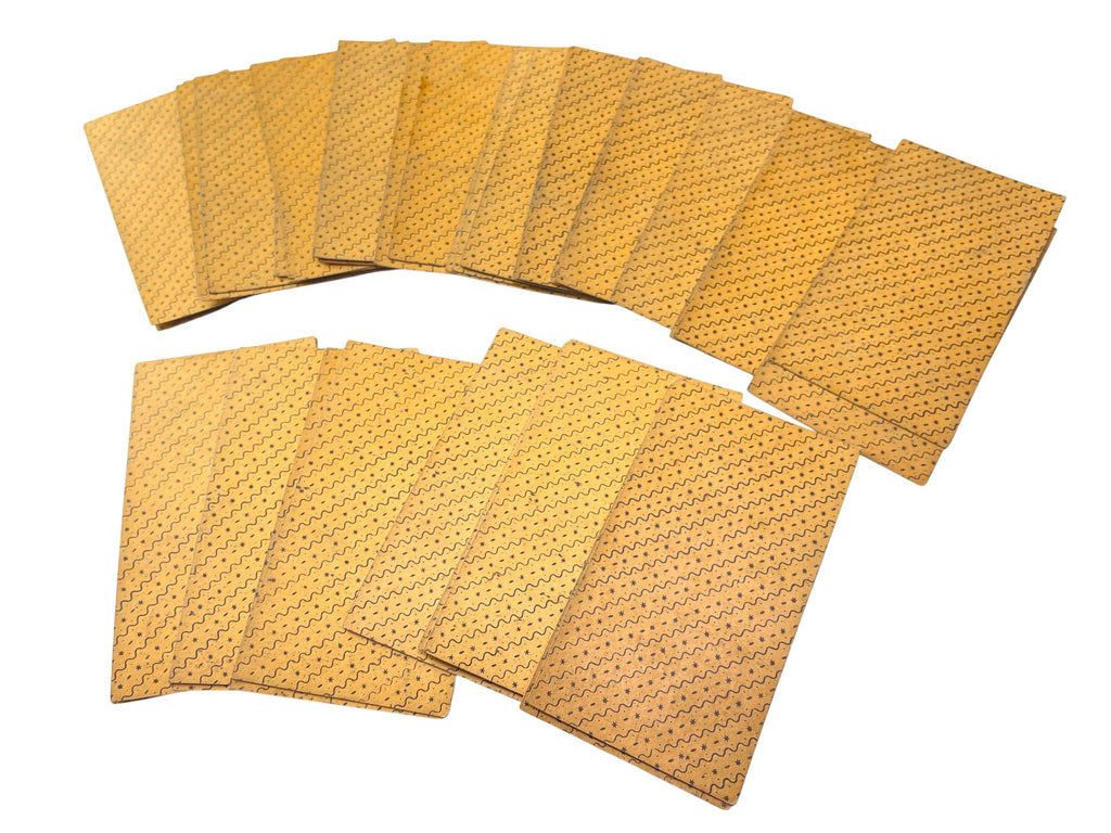 · Versos/Backs: yellow ochre background with a diagonal pattern of dots, dashes & squiggly lines in black
