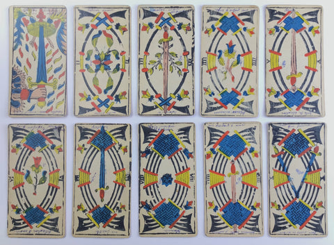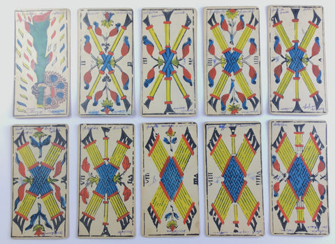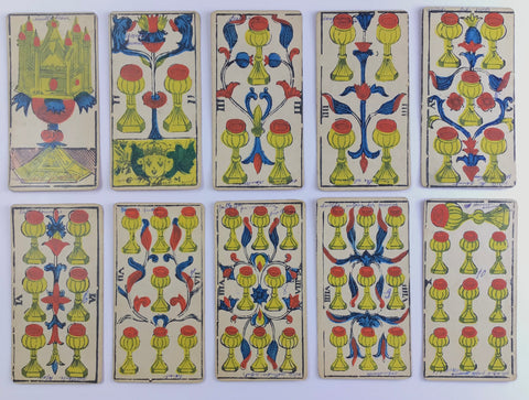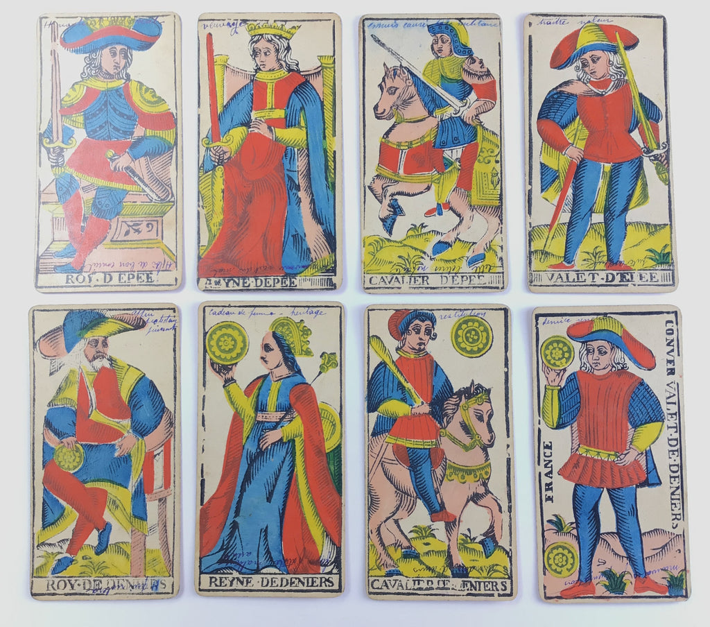 DESCRIPTION: c.1880 Camoin printing of the famous 1760 Tarot de Marseille (TdM), realised with the original 1760 woodblocks of Nicolas Conver. The pearwood moulds were used for more than a century, and, as a result, the Marseilles Tarot by Nicolas Conver has been the subject of several colourings, with colours differing both in the palette used and the distribution of the colours on the surface of the cards.