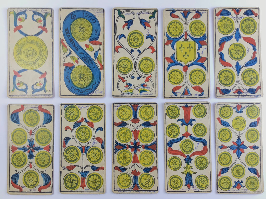 · Cards: "Na Conver 1760" on 2 of Coins; "Conver France" on Valet de Deniers