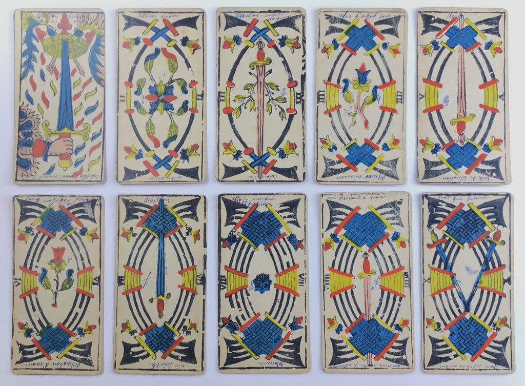 This c.1880 printing and colour combination by the renowned card-maker Phillippe Camoin was made rather famous in 1930 when Paul Marteau re-designed the TdM that was subsequently published by B.P. Grimaud, Paris, France. Marteau coloured the cards after this c.1880 Camoin printing, using the well-known colour palette of yellow, red, blue, and green. Marteau’s redesigning of the deck made this colour combination famous, becoming perhaps the most well-known 20th-century printing of the Tarot de Marseille.