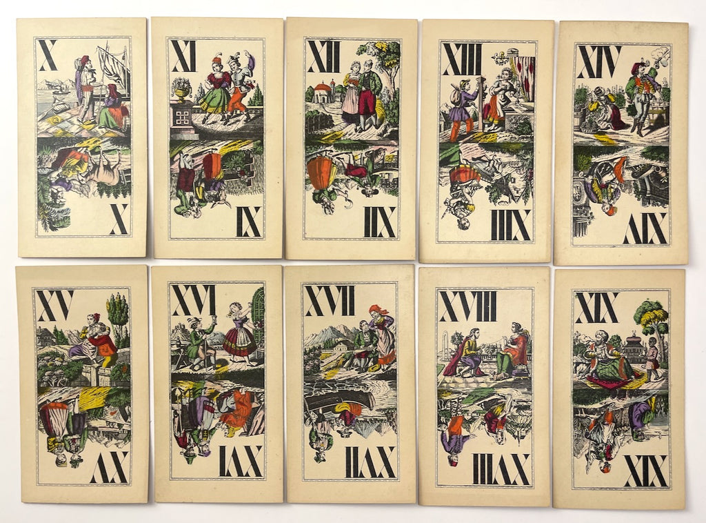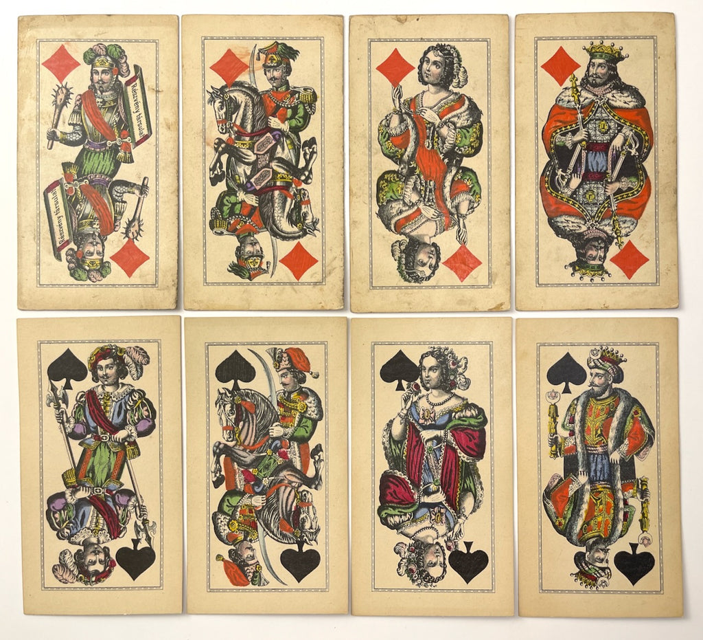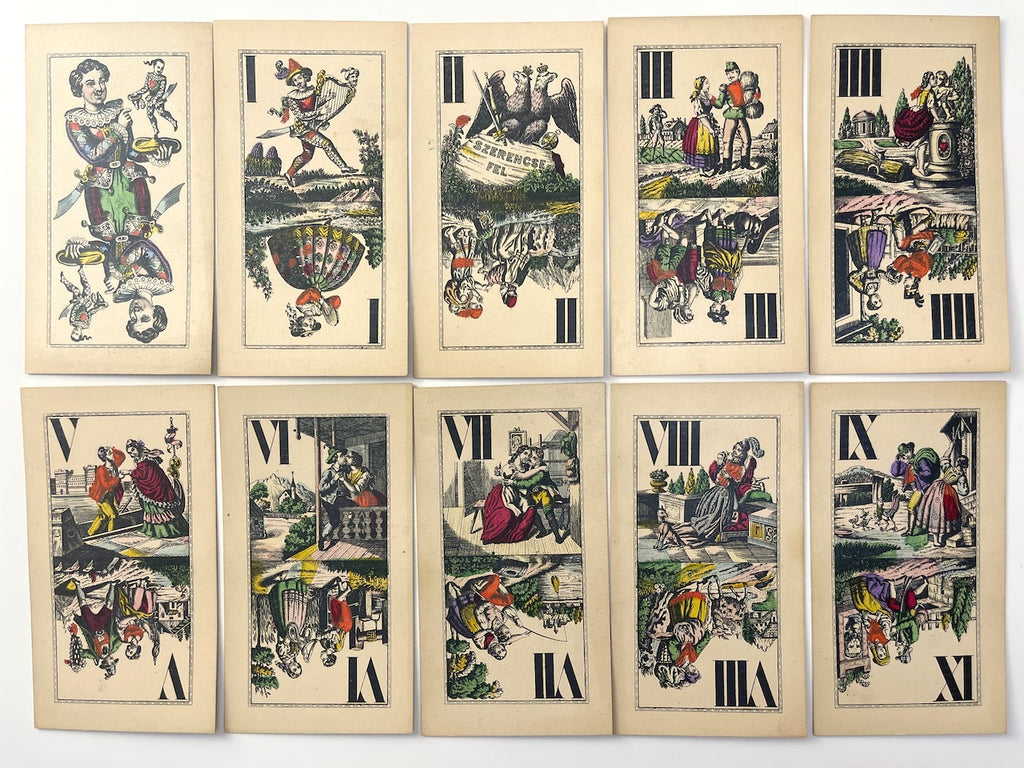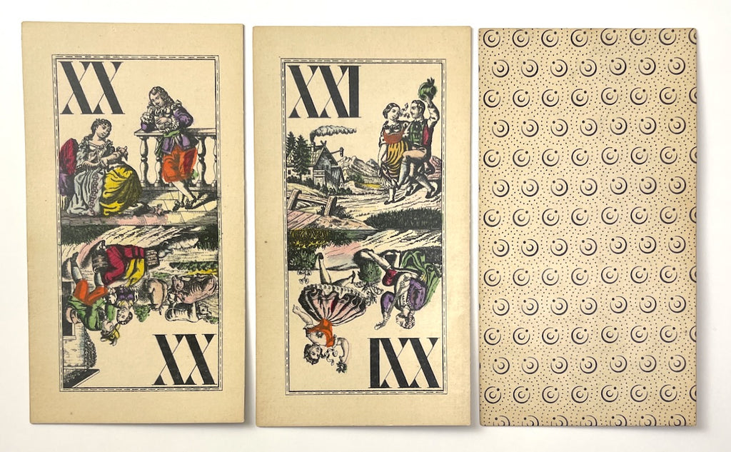 - Style: Austrian Tarock (21 Trumps + Fool, with 4 suits of 5 cards), "It is not at present known if, in common with FT-2.2 and FT-2.3, this pattern was ever issued in 42-card form (suppressing the red 2-4s and the black 7-9s) but it is quite possible." (The International Playing-Card Society, 1978)