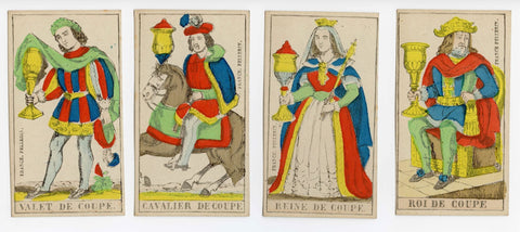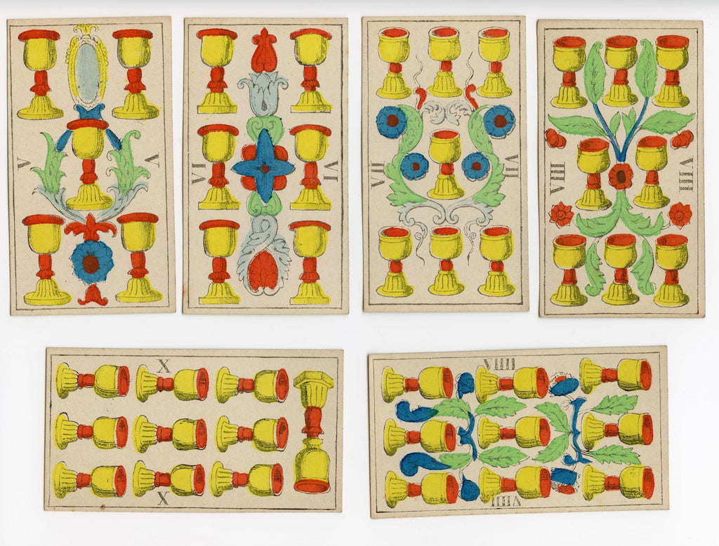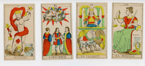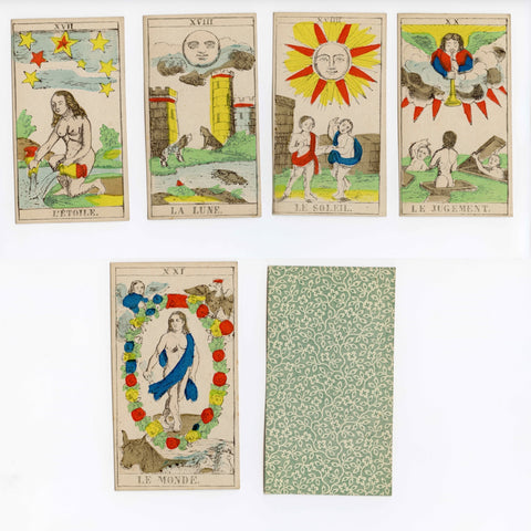 Description: Incomplete (75/78 cards) copy of the Épinal Tarot, printed c.1860. The woodcuts were produced by the famed engraver, François Georgin (1801-1863) and the deck was published by Pellerin & Cie. for over fourty years.