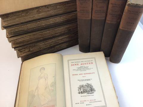 Ed. Brimley Johnson. Letters and Novels of Jane Austen. New York, NY: Frank S. Holby, 1906. Chawton Edition, limited, No. 925 of 1250; 10 of 12 volumes (missing Volume III and V), Hardcover. 8vo; bound in brown cloth with paper labels on spines; title pages printed in red and black; with coloured frontispieces, and several coloured illustrations in each volume; deckled pages.