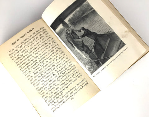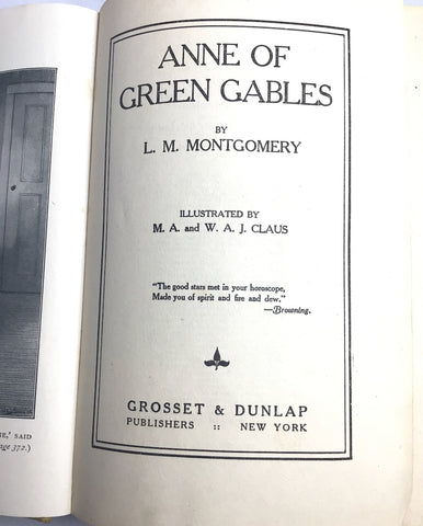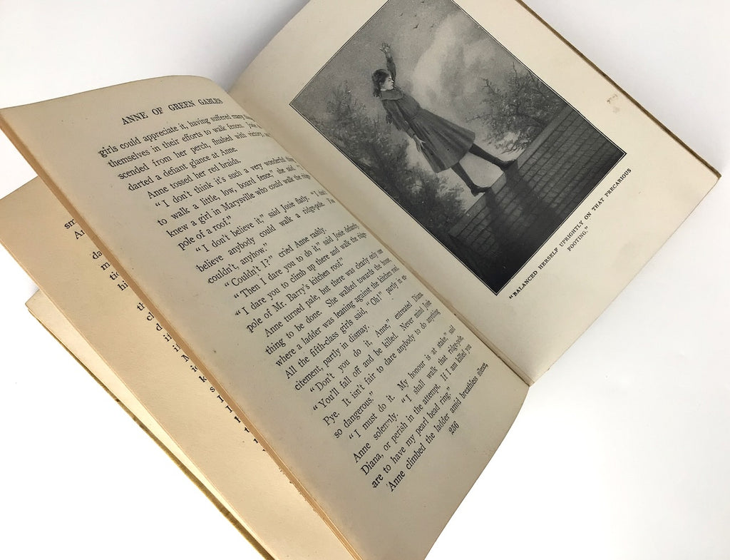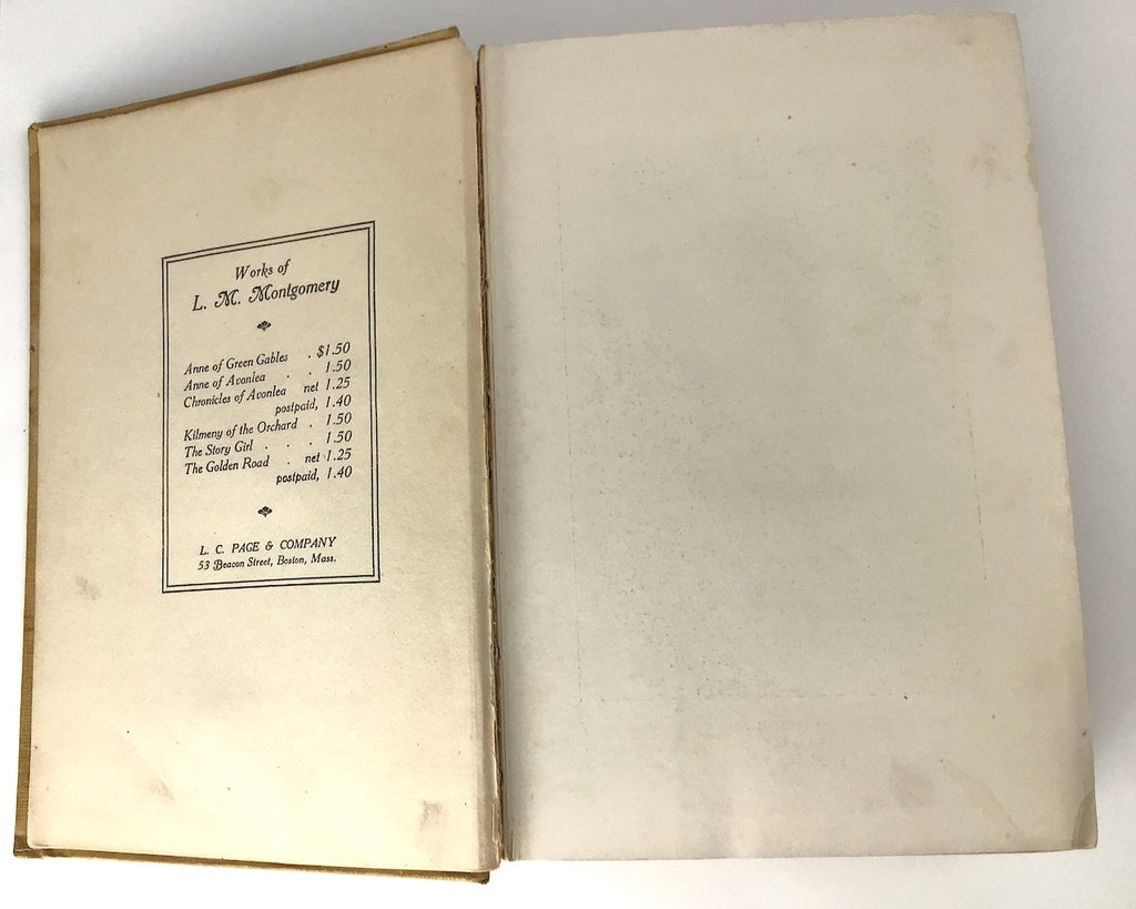Description: Lovely early printing of Anne of Green Gables (1918) in the beautiful gold/yellow/tan cloth boards, following the style of the 1908 1st edition, with an inlay portrait of Anne-girl, her auburn hair worn up, and perhaps wearing puffed sleeves. Illustrated with 3 plates along with illustrated frontispiece. Complete with 10 pages of advertisement at the rear. 38th printing, of which 150,000 copies were issued.