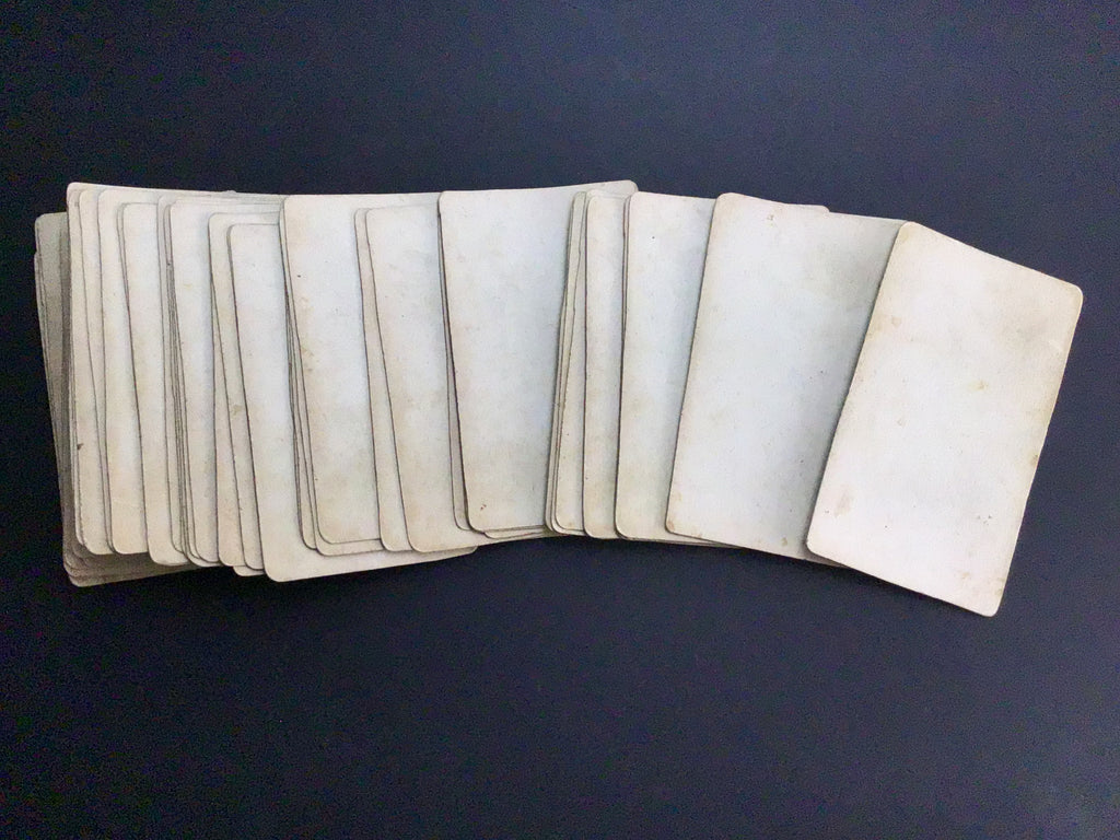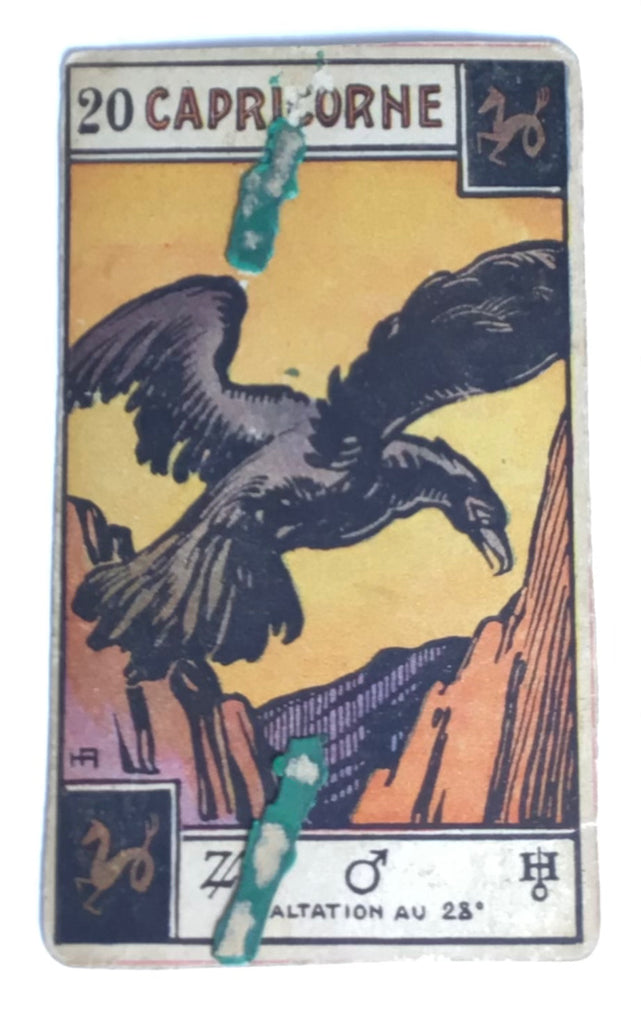 Very good condition. The deck is complete with 48/48 cards; cards with some signs of use and minor corner wear; blank reverses with signs of patina and yellowing; 20 Capricorne with (what seems) green wax stuck to the card (see photographs).