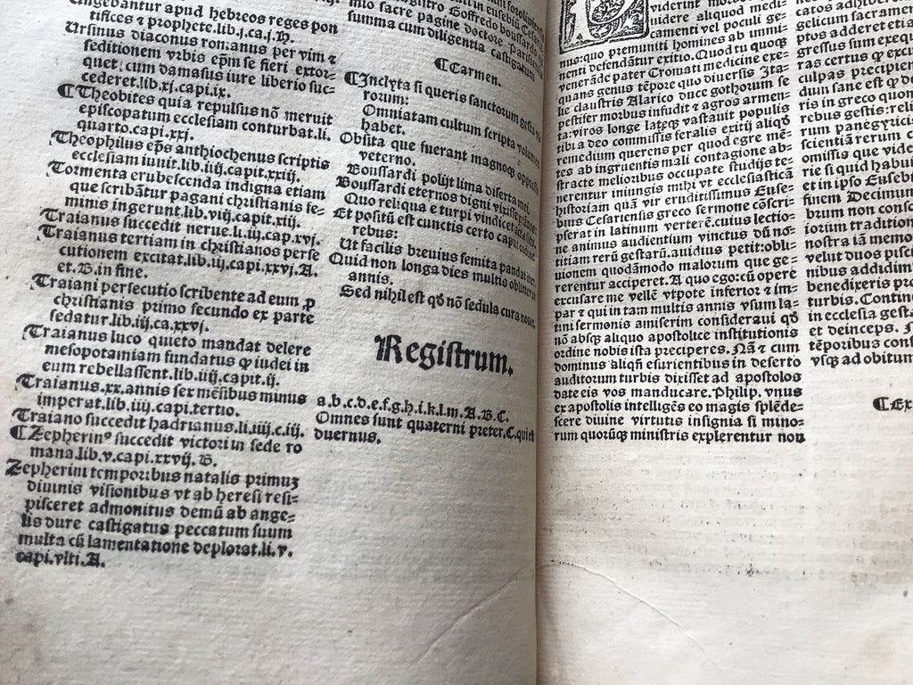 Full Title Page : Historia ecclesiastica, Eusebii Cæsariensis viri de vita ac literis optime meriti Ecclesiastica historia : quæ tum iniuria temporum, tum incuria calcographorum penitus obsolescebat, summa fide recognita, pristinæq[ue] integritati restituta in lucem educta est, cum indice principaliu[m] sententiaru[m] hac in excellenti historia contentaru[m] serie alphabetica adamussim collecto & emendato Habes amice lector in proxime sequenti pagina non inelegantem epistolam huiusce præclari operis summam vtilitatem abunde complectentem, quam dominus Gaufridus Bouffardus sacræ theologiæ doctor huic operi præponi curauit. 1533