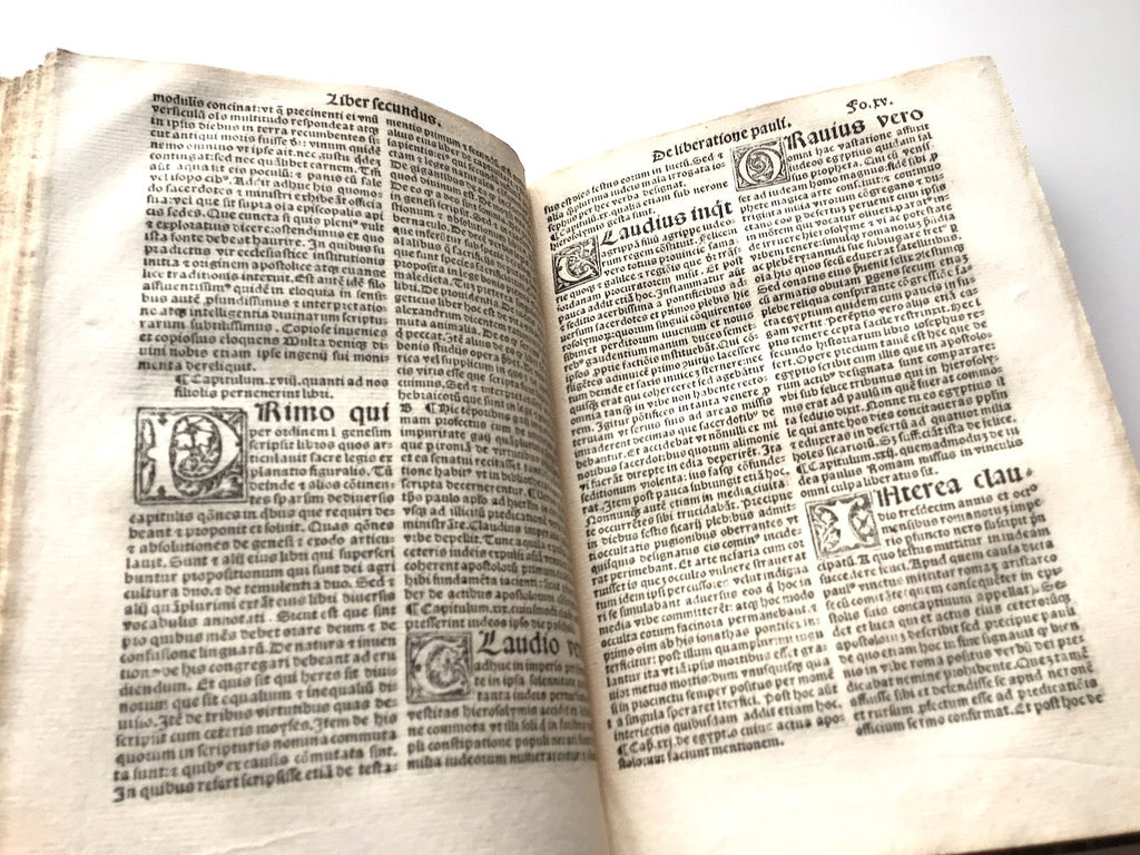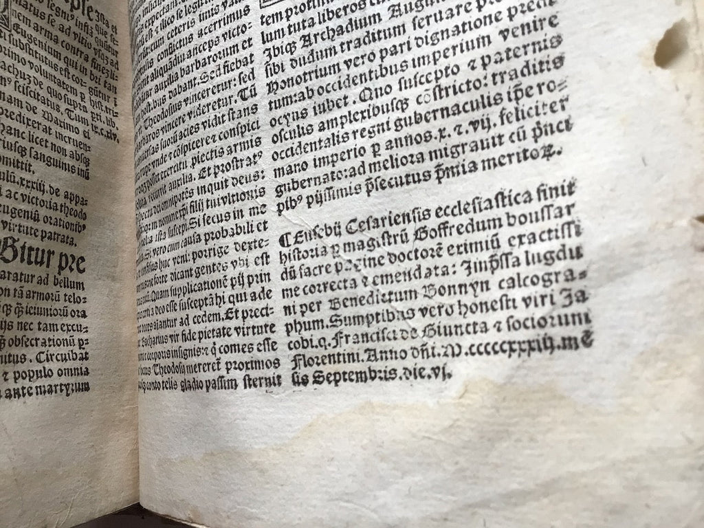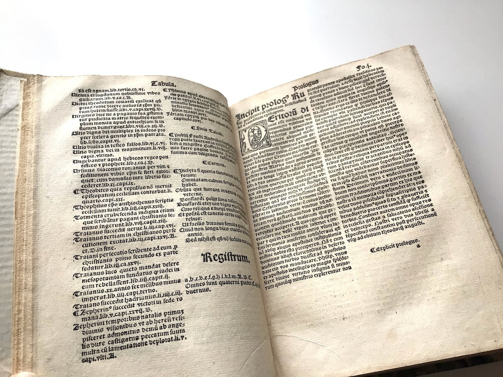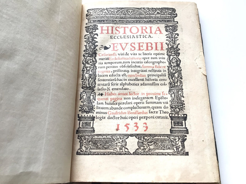 Rare 16th-century Lyons edition of the Historia Ecclesiastica, also known as The History of the Church, a 4th-century chronological account of the development of Early Christianity from the 1st century to the 4th century, composed by Eusebius, the bishop of Caesarea.  Published by Benoit Bonyn for Jacopo and Francesco Giunta in 1533. Dedicatory epsitle by G. Boussard to Étienne Poncher.