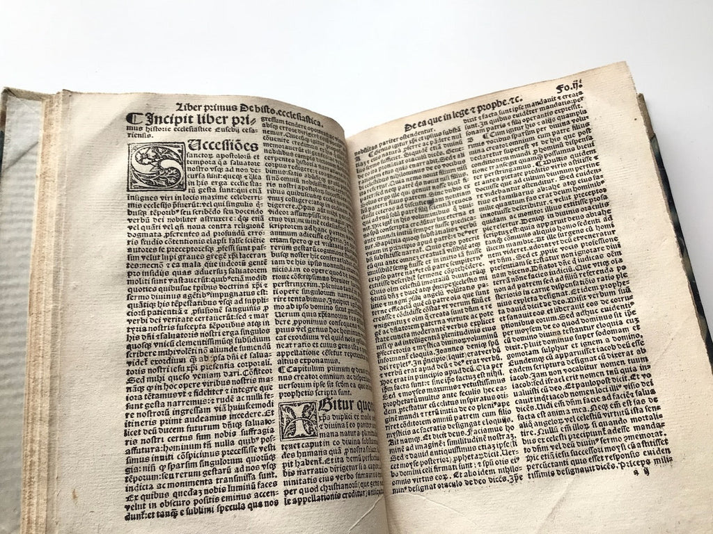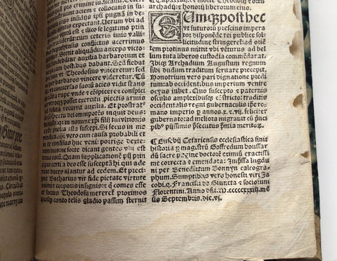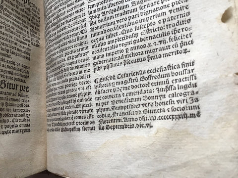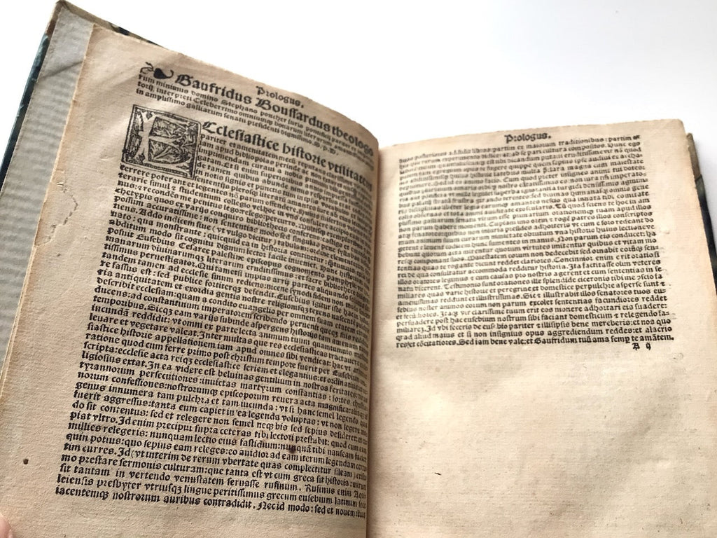 Eusebius. Historia Ecclesiastica. [Lugduni (Lyon): Benedictum (Benoit) Bonnyn for Iacobi q. Francisci de Giunta], 1533. 8vo, (20)-xcvi f.; Imprint from colophon. Text printed in two columns, blackletter text, decorated woodcut initials, title in red & black within ornamented architectural woodcut border, Jacques Giunta's printer device on the verso of final leaf. Bound in later half-vellum with decorated green papers.