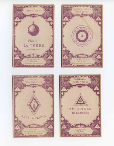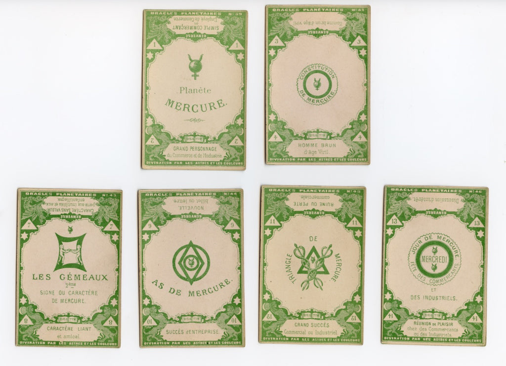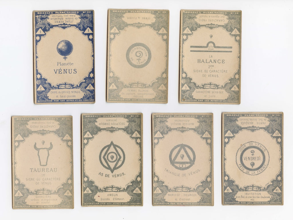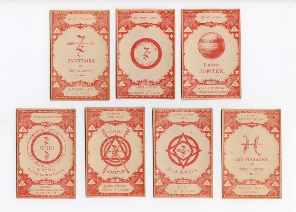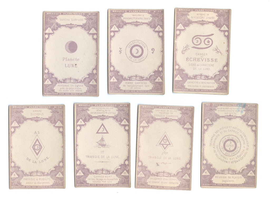 Description: The original and rarely seen 1867 Oracles Planetaires, conceived by A. de. Para d'Hermes. The deck has 58 cards (only 55/58 present here) + 2 consultant cards, and was originally sold with a 47-page booklet. Unfortunately, the booklet is absent here but is available online at Gallica, the online digital library of the Bibliothéque Nationale de France (BnF). Divination by the stars and colours.