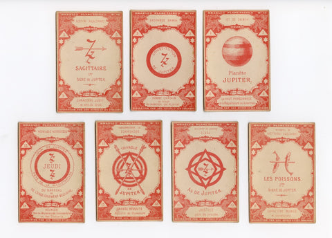 BOOKLET TITLE: [Oracles Planetaires, Sorcier du XIXe Siècle: Tarots Parisiens; Astronomiques. Physiogiques et Psychologiques. Jeu Entièrement Nouveau de 58 cartes, formant 116 tableaux et un Nomber infini de combinaisons donnant des Réponses Précises sur La Destiné; Passée Présente et future des Personnes; Jeu de la Bonne Socièté et du Grand Monde. Divination par les Astres et les Couleurs.]