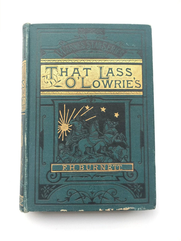 Warne’s Star Series copy of “That Lass O’Lowrie’s” c. 1880, Teal Binding with Gold Accents and Embossed Images