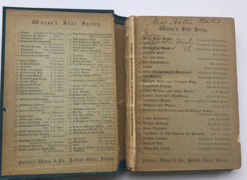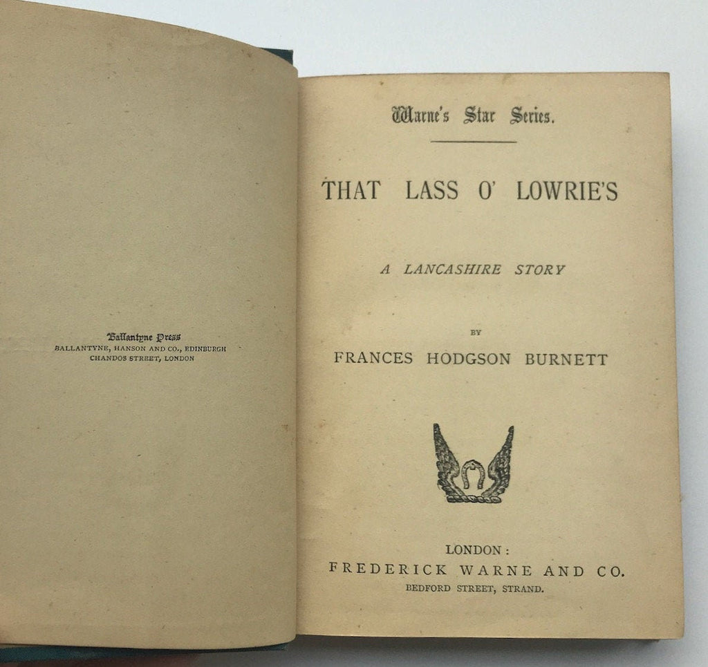 Warne’s Star Series copy of the novel “That Lass O’Lowrie’s” c.1880 by Frances Hodgson Burnett. A visually interesting piece with teal binding and gold accents. The spine features an image of an angel holding a small child and the cover, the Greek god Helios (or Apollo) in his sun chariot.
